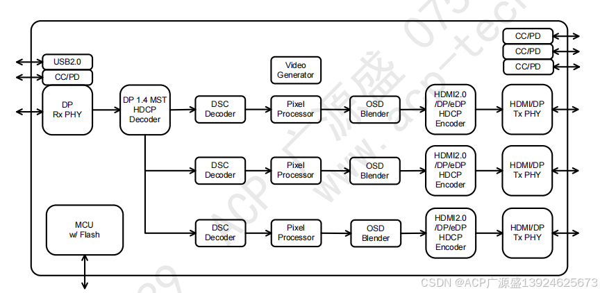 - 本质属性:USB Type-C Alternate Mode 信号转换器,支持 DisplayPort 1.4 MST 输入,三通道(TXA/TXB/TXC)HDMI 2.0/DP/eDP 输出,集成 DSC 解码器、OSD 叠加器、嵌入式 MCU 及 USB PD 3.0 控制器。