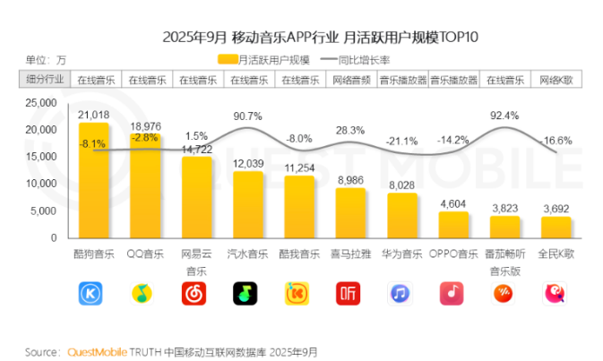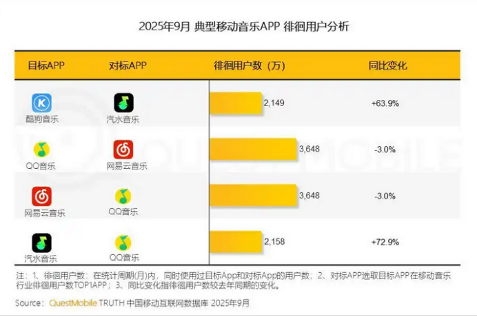 QuestMobile数据显示,2025年9月,尽管汽水音乐与QQ音乐、网易云音乐的"徘徊用户"(即同时使用的用户)规模同比激增超70%,后两者的月活大盘却保持稳定,汽水音乐难以实质性分流头部两家的核心用户。