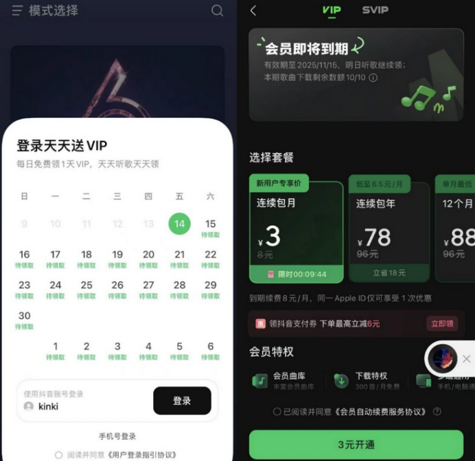 因此,为了用户增长,"免费"成了汽水音乐活字招牌。新用户每日登录即可获得长达半个月的会员体验,后续连续包月费用也低至8元,价格显著低于市场主流。应用界面上,"免费"字样被置于醒目位置,并设有专属福利中心,通过看广告听歌、红包雨、盲盒开奖等游戏化运营手段,持续强化免费属性。