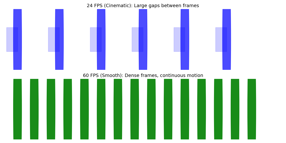 帧率越高,相邻两帧之间的时间间隔越短(24fps 间隔 ~41.6ms,60fps 间隔 ~16.7ms),对于快速移动的物体,高帧率能记录更多的运动细节,减少"跳跃感"和拖影。
