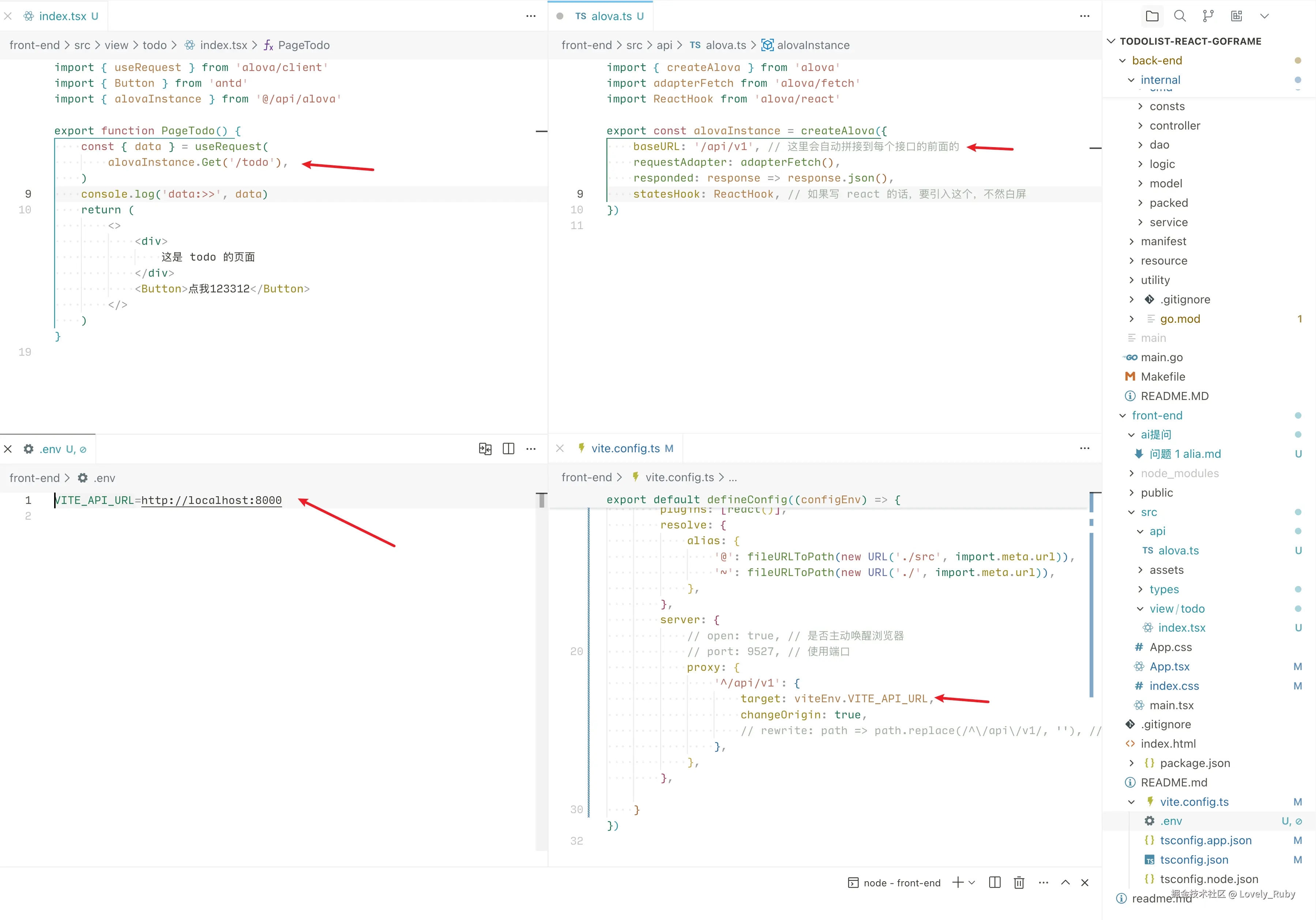 /api/v1分组之前,前端是请求不到后端的,我以为是后端没有配置跨域,(后来我也没去配置go-frame的跨域,因为不是这个问题) 是因为什么呢,就是vite的代理,我以为前端请求的/api/v1/todo,就会走代理,之后代理会把api/v1给去掉,但是这个想法是错误的