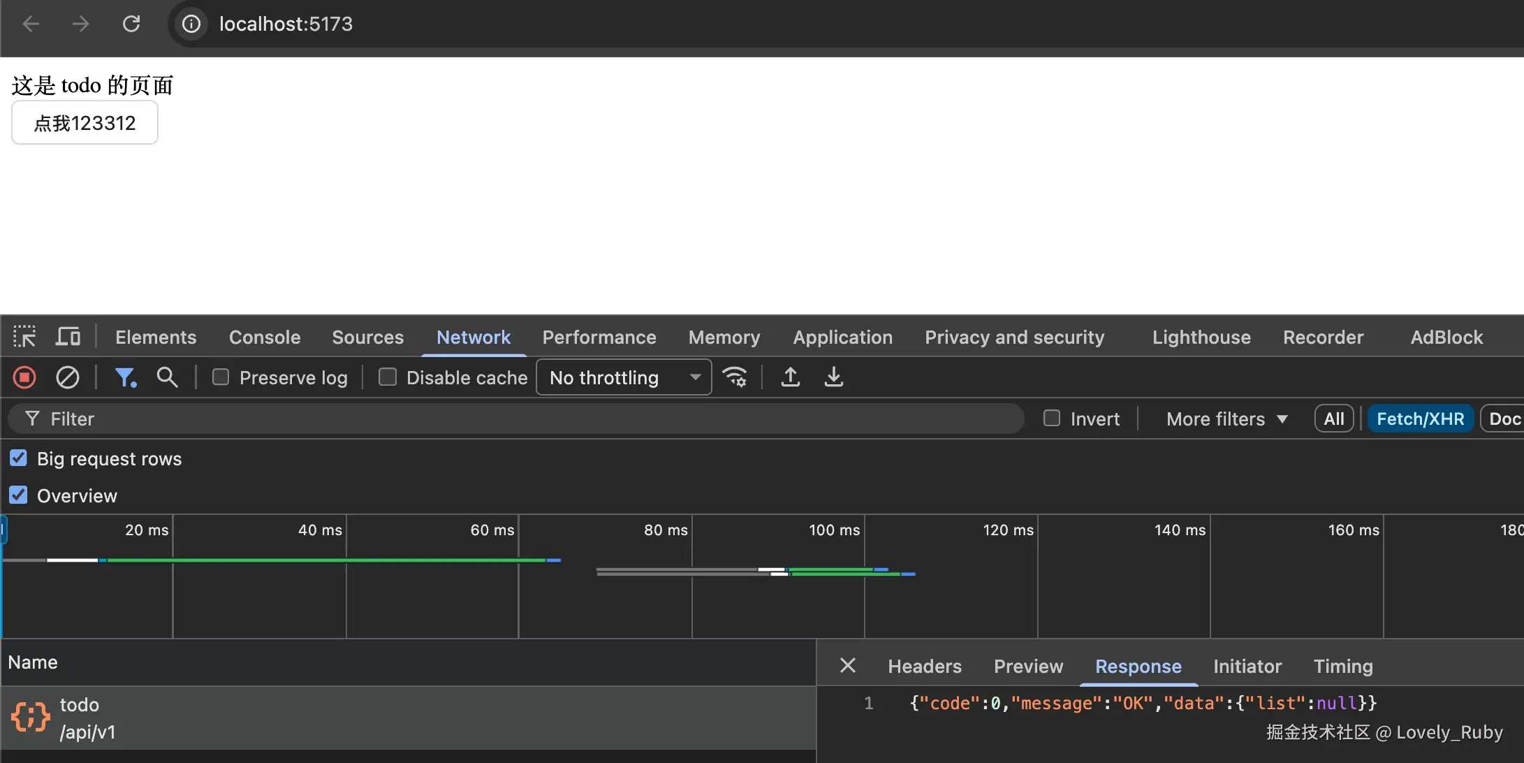 然后再浏览器中试一下,可以看到前端能请求到接口了!