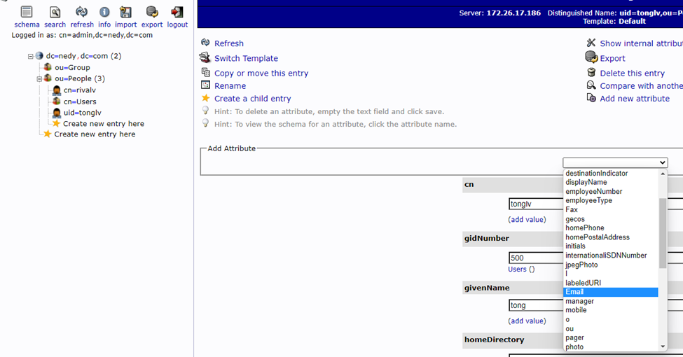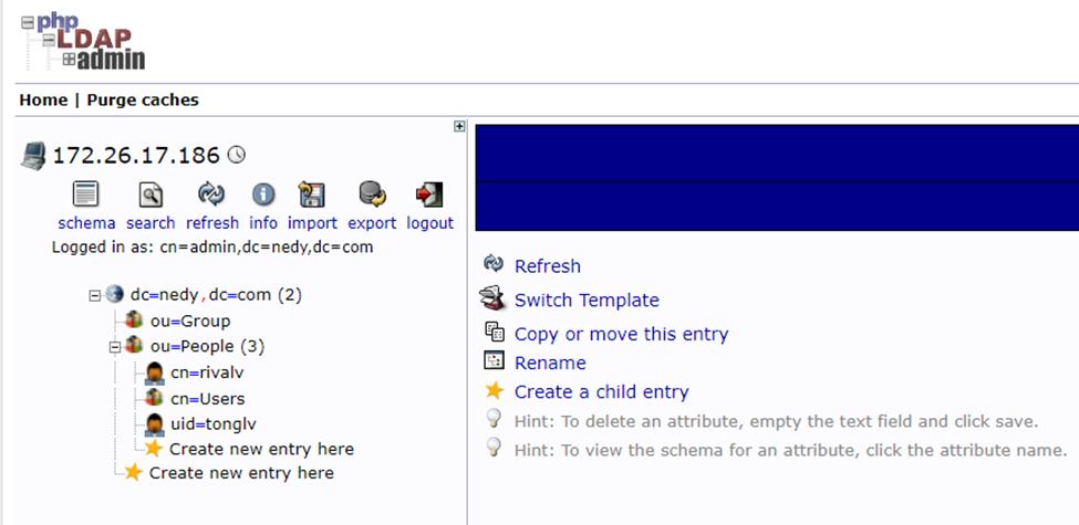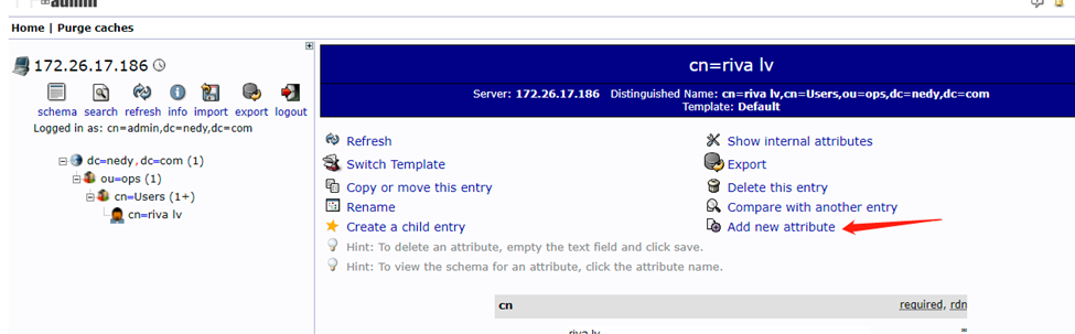 此时该用户的dn为cn=rivalv,ou=People,dc=nedy,dc=com如果想使用uid来识别用户可以在界面中rename修改用户的dn。