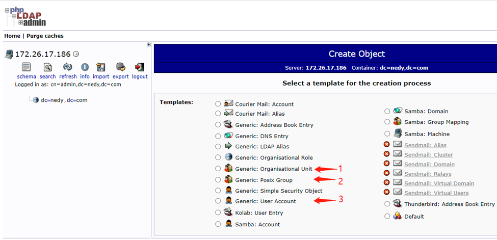 首先要新建 Organisational Unit、Generic(组织单位),在该组织下新建Posix Group(默认用户组),然后再新建 User Account(用户帐户),按照顺序依次创建即可。