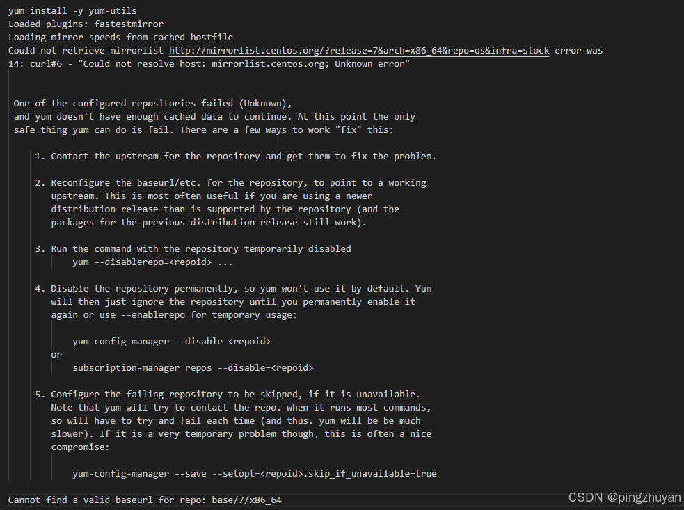 CentOS 7 官方镜像源已于 2024 年 6 月 30 日停止维护(EOL),系统默认的 mirrorlist.centos.org 地址失效,导致 yum 无法解析镜像地址、找不到可用的 base 源,进而安装包失败。