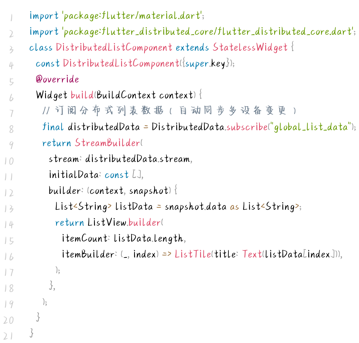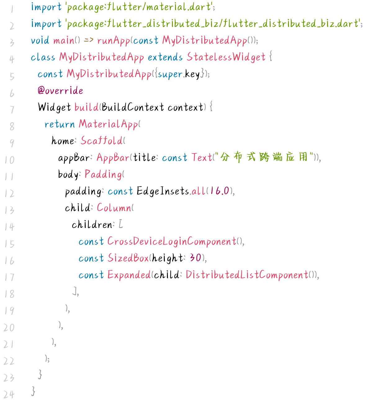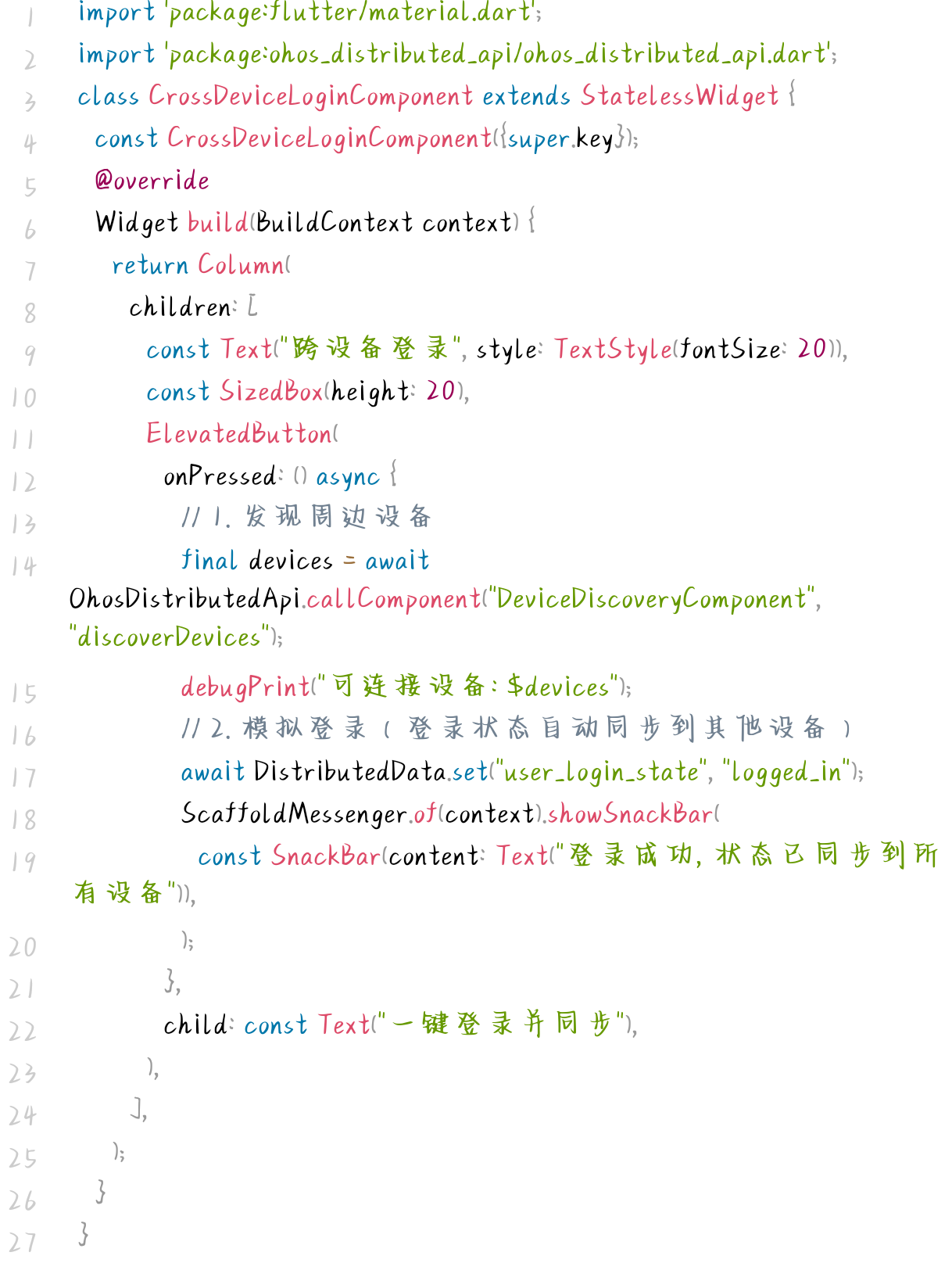 - 跨端协同无感知:Flutter端无需关注分布式实现细节,通过组件调用即可实现跨设备协同;