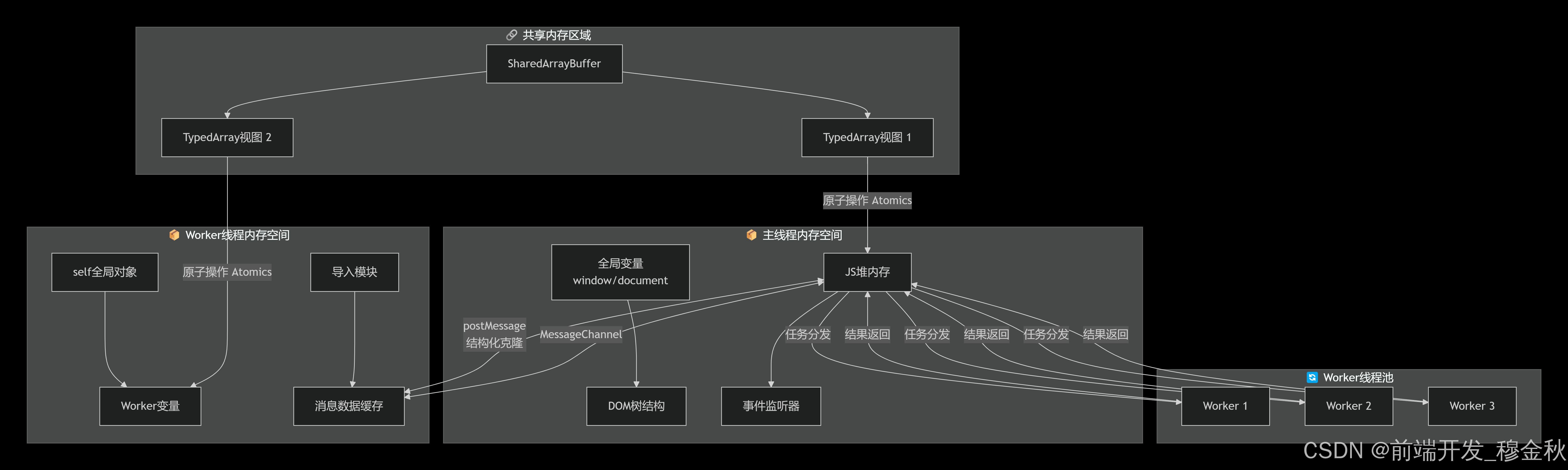 主线程与工作者线程之间 不能共享内存 ,只能通过 postMessage() + onmessage 异步传递消息(结构化克隆算法序列化数据)。