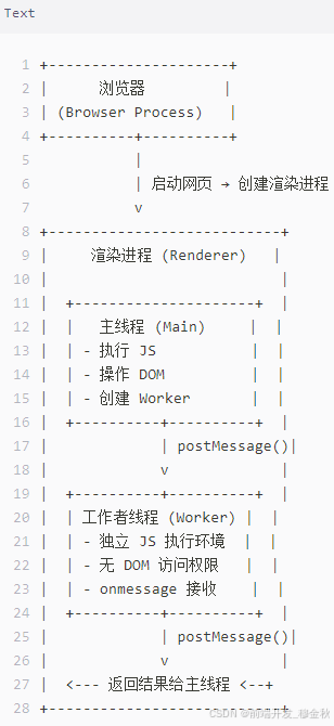 | 工作者线程(Worker Thread) | 由主线程创建,用于在后台执行 JavaScript(如 Web Worker),不能访问 DOM |