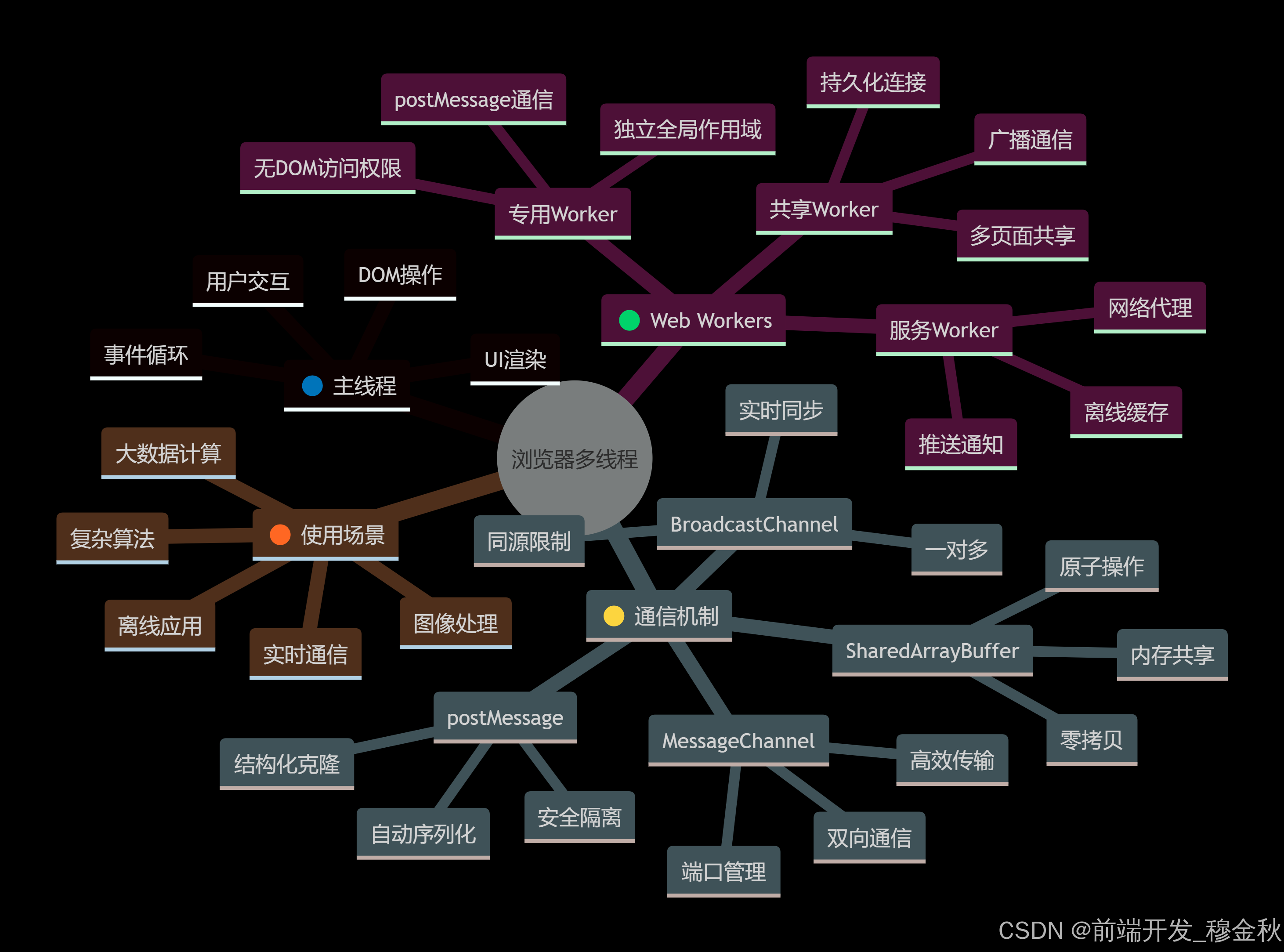 | Service Worker | 用于拦截网络请求、实现离线缓存(运行在独立线程,但生命周期由浏览器控制) |