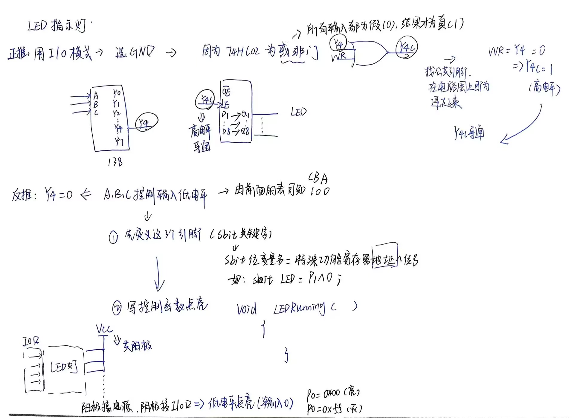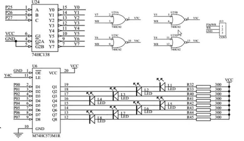 对于前面这些较为简单的模块,我们一般用IO引脚去控就好,值得注意的是:在点亮LED灯是我们不能直接简单粗暴的向P0写0,因为我们的原理图上多了573锁存器这个家伙,咱们要通过它的Y4C引脚去控制D1-D8->Q1-Q8,然后再去控制灯!