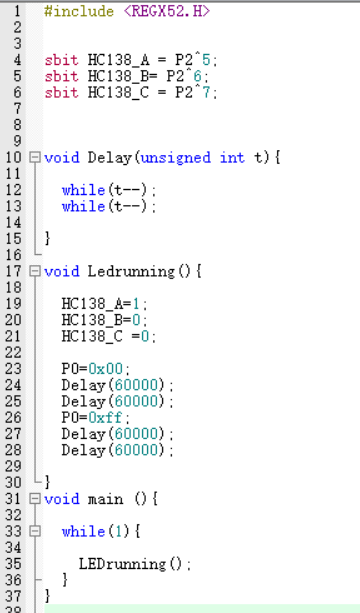 了解了一整张图各个模块的大致内容后,我们要把注意力放到细节研究。首先是点灯,在其他板子的学习时我们一般分为跑马灯和流水灯2种情况研究。(其实只要会写函数,while、for循环就万变不离其宗了)