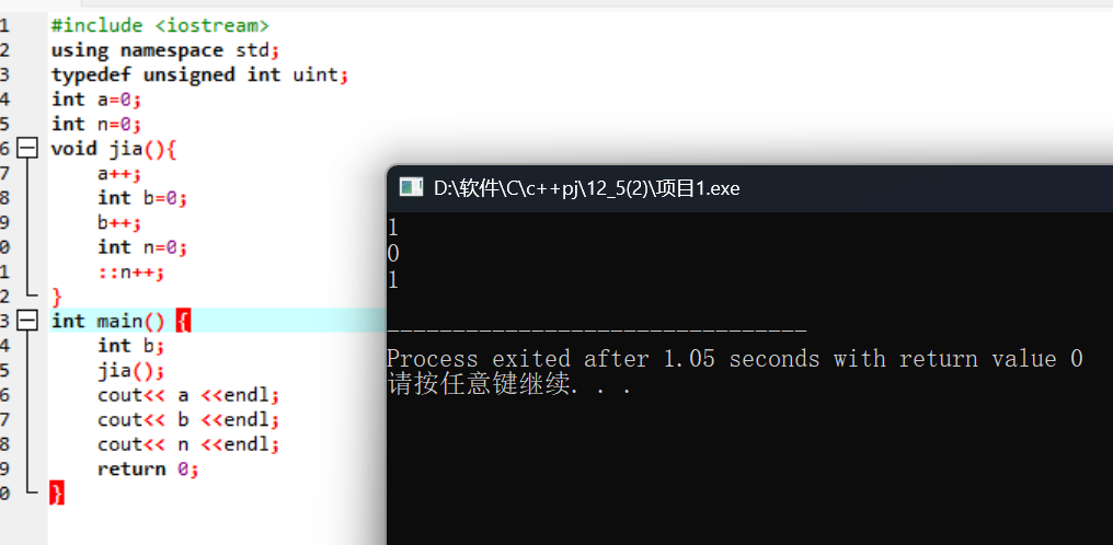 全局所以的函数使用同一个变量,局部变量在函数内定义使用,当全局变量和局部变量名相同时先使用局部变量,如果想使用全局变量加::