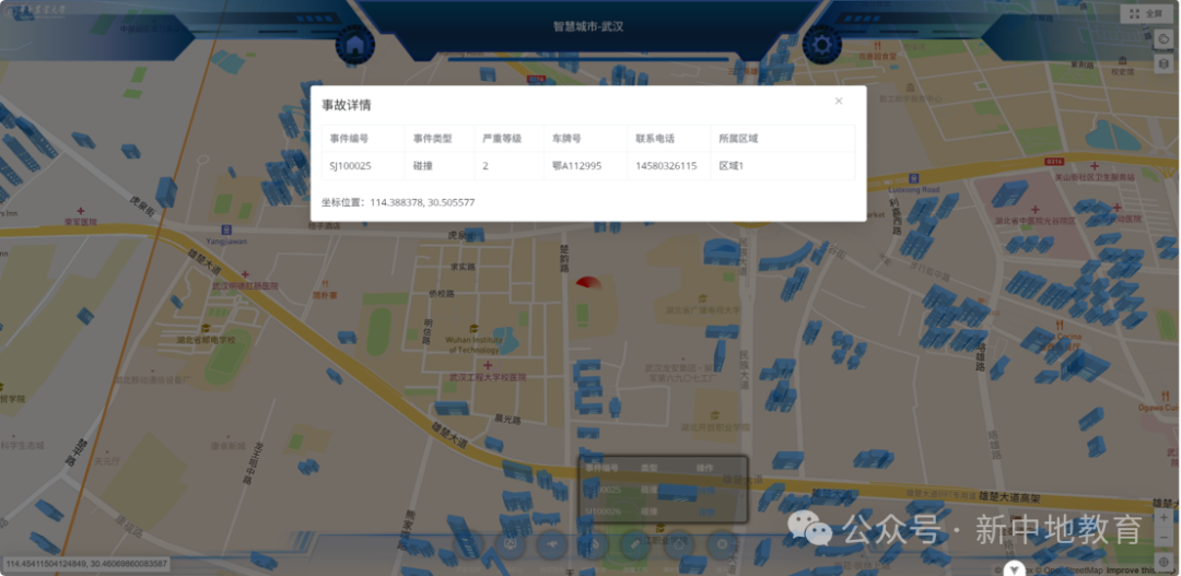 拉框查询某一地区的突发事件,并显示事故类型、事故区域、车牌号等信息。