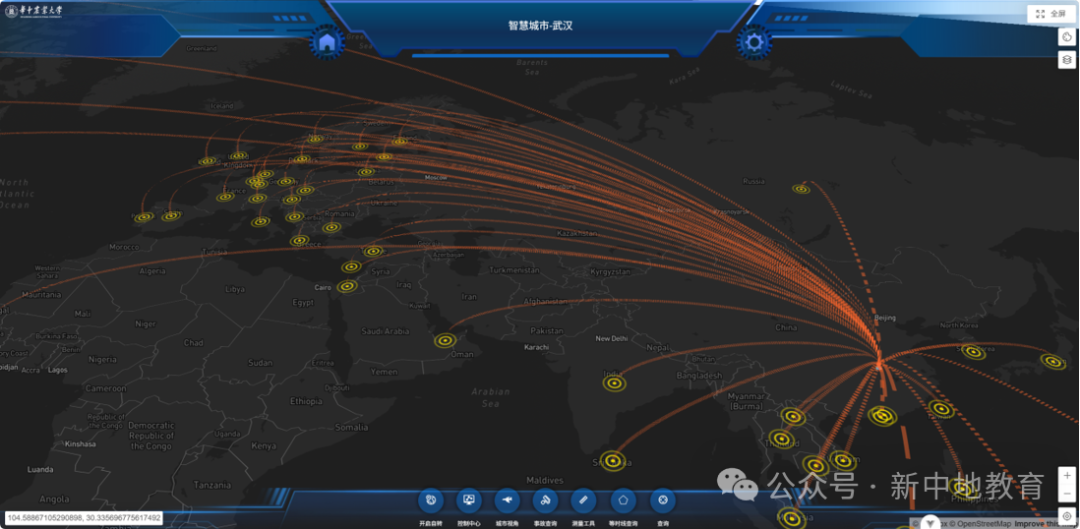 以武汉为起点,统计武汉到全球多个国家的飞行航线图。