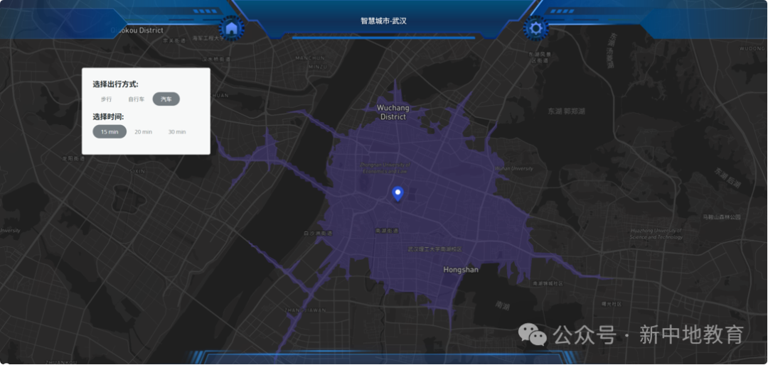 根据用户定位信息,在选择框中选择不同范围的等时圈,包括15、20、30分钟等时圈。