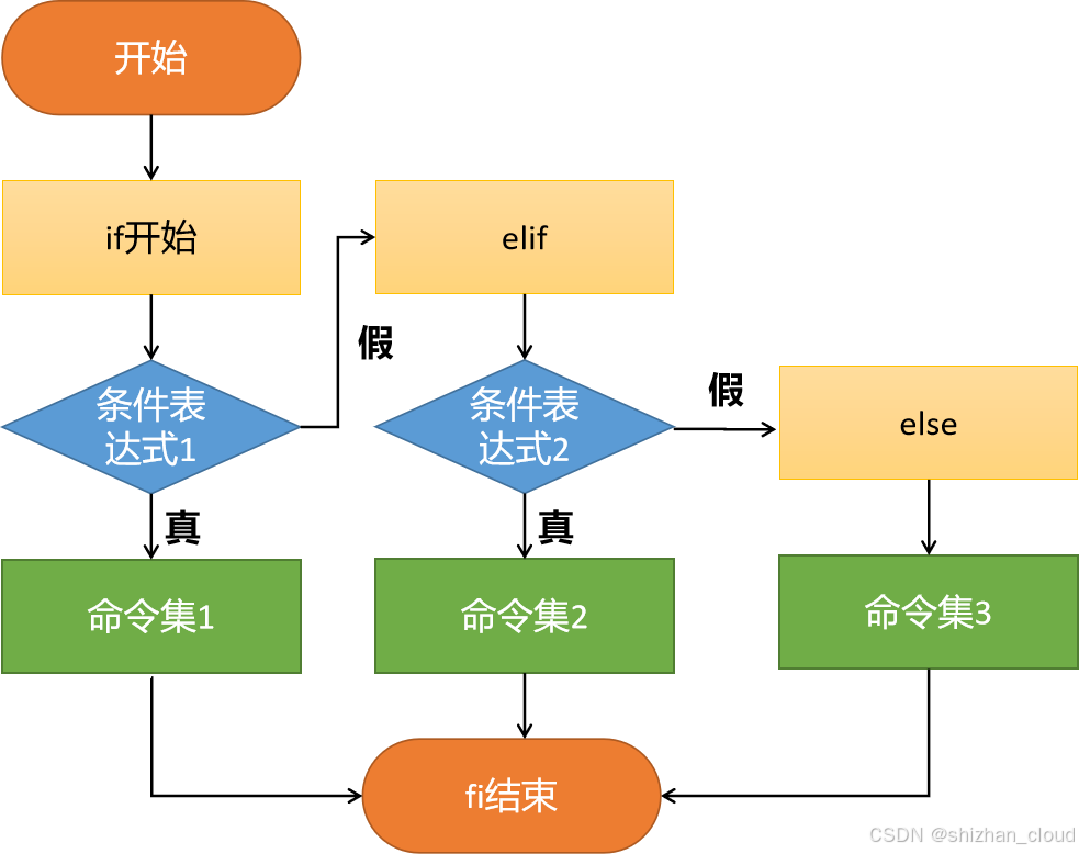 上文的"<条件表达式>"部分可以是test、口、[[]]、(())等条件表达式,甚至可以直接使用命令作为条件表达式。每个if条件语句都以if开头,并带有then,最后以fi结尾。