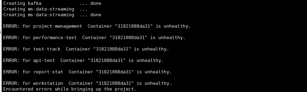 由上述日志可看出workstation、performance-test、api-test等都是不健康的,即服务没起来