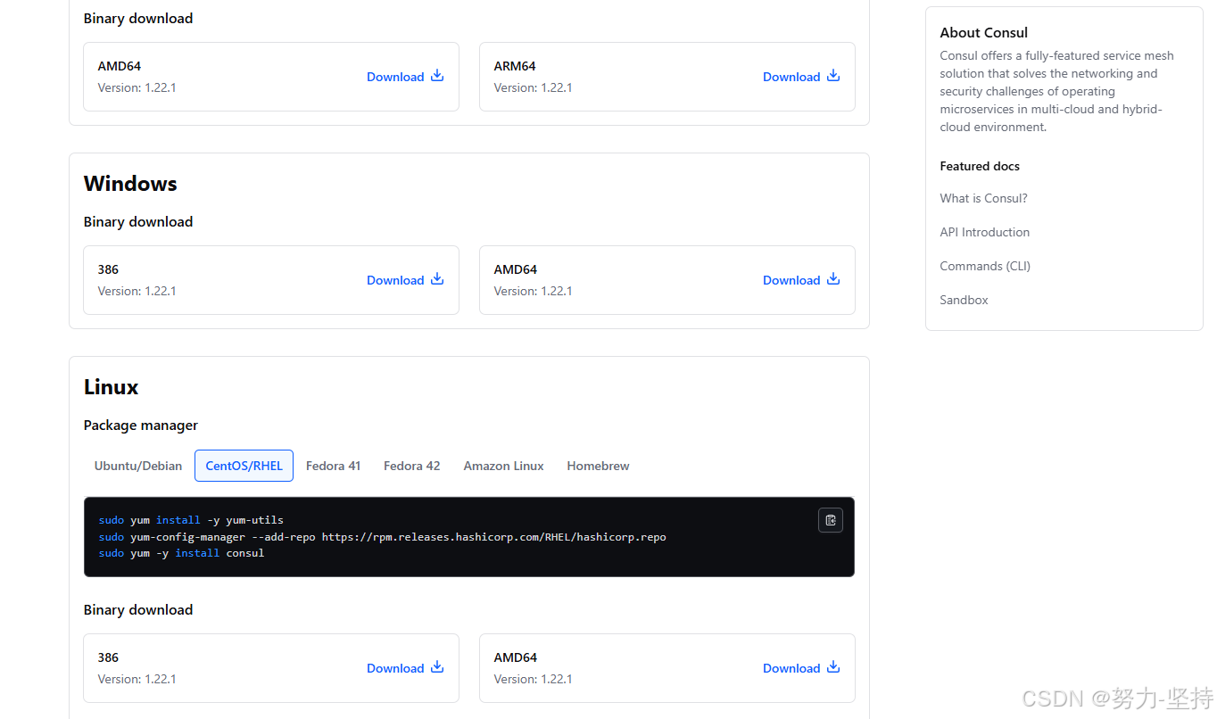 打开Consul官网 https://developer.hashicorp.com/consul 根据不同的操作系统选择最新的 Consul 版本。我们以 Windows 64 操作系统为例。