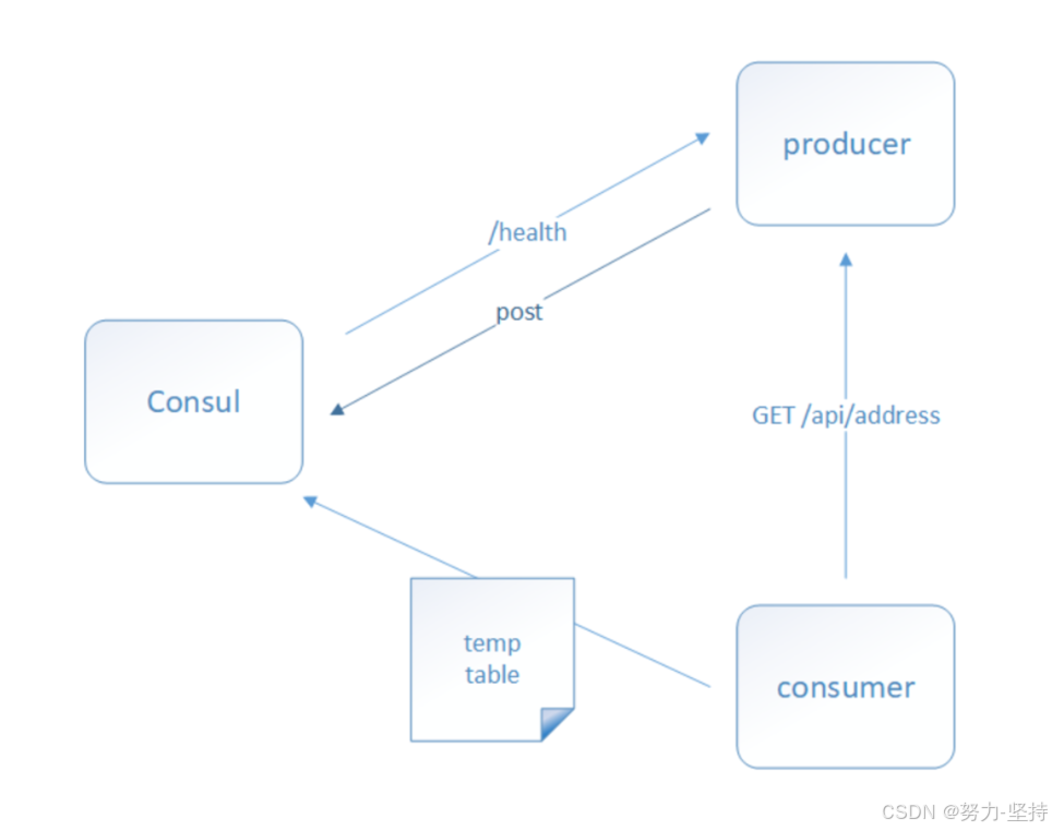 1、当 Producer 启动的时候,会向 Consul 发送一个 post 请求,告诉 Consul 自己的 IP 和 Port;