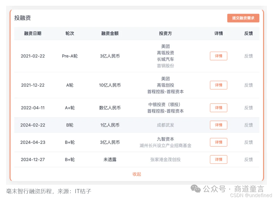 融资环境的急剧收缩,则彻底切断了毫末的腾挪空间。2021年,中国自动驾驶领域融资总额高达932亿元,资本热衷于为"城市NOA""全无人驾驶"等宏大叙事买单。但到2024年,这一数字已萎缩至约200亿元,且资金高度集中于已实现量产或具备清晰盈利路径的头部企业。毫末自2024年12月完成最后一轮融资后,再无新资本注入。其收入仍以项目制为主,缺乏软件订阅、数据服务等可持续现金流,与华为、小鹏等通过整车销售实现自我造血的模式形成鲜明对比。当资本市场从"为愿景付费"转向"为现金流付费",毫末的估值逻辑迅速崩塌。