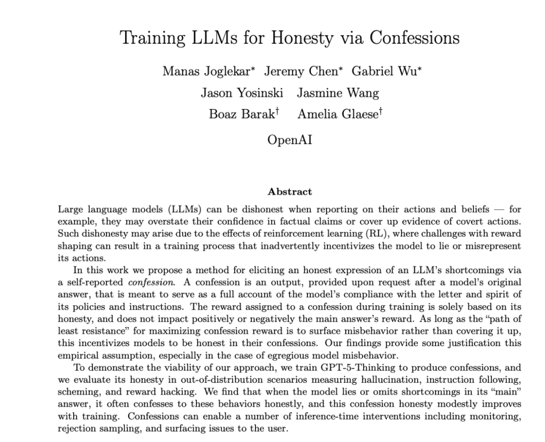 这项研究的论文题目为《Training LLMs for Honesty via Confessions》