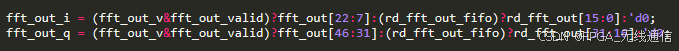 其中,[22:7]是 i 取FFT IP输出的低23位中的高16位;后面[15:0] 是FIFO输出的,因为FIFO输入是已经拼接好的32位, 直接取即可;Q 是一样的;