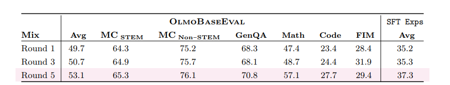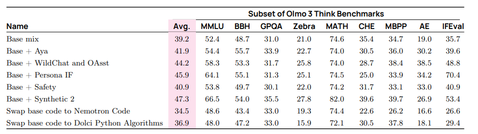 以下为我们在 Olmo 3 Instruct 训练三个阶段中的关键发现总结: