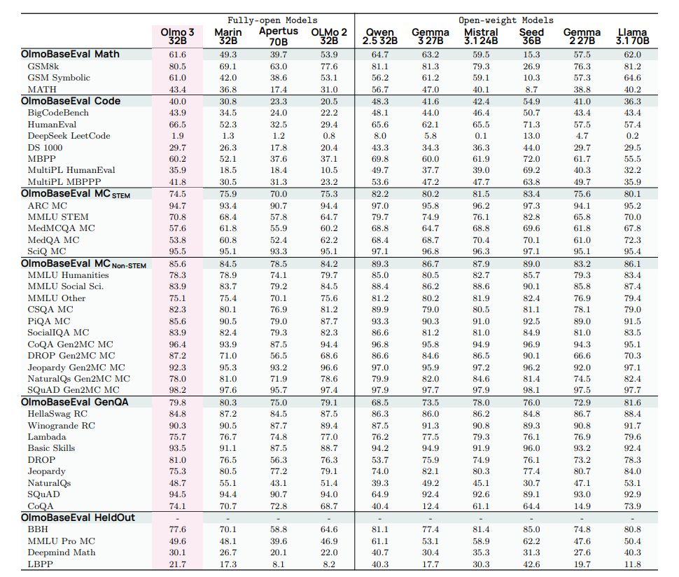表 2 和表 3 将 Olmo 3 Base 与领先的开放基础模型进行比较,展示了我们的评估设计的有效性以及 Olmo 3 Base 在广泛能力上的强劲表现。