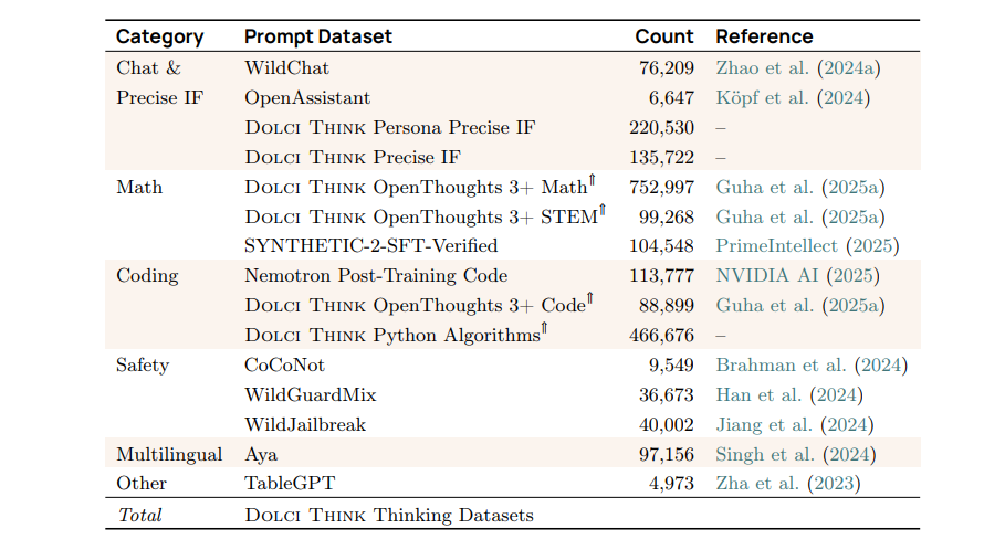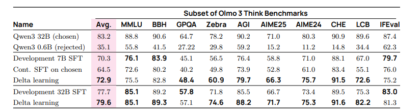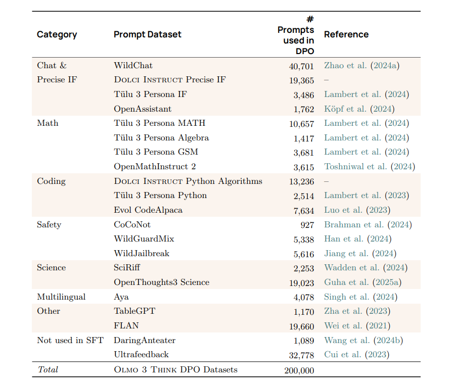 -- 我们引入了 Dolci Think SFT(§4.2)、Dolci Think DPO(§4.3)和 Dolci Think RL(§4.4),这是针对数学、编码、指令跟随以及通用对话等广泛关键能力设计的最新后训练数据集。这些数据集包括带有长思维链的 SFT 合成示例、基于 Delta Learning(Geng et al., 2025)洞见构建的高质量对比数据,以及包含可验证与不可验证领域的强化学习挑战提示。值得注意的是,我们在构建偏好微调的对比实例时采用的新方法扩展了模型的推理边界,使其超越仅靠 SFT 所能达到的水平,并为有效强化学习做好准备。