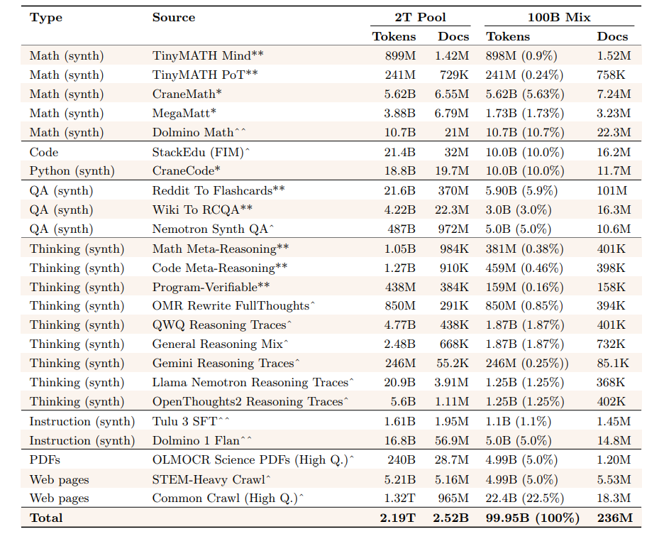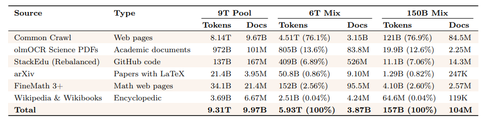 Open Artifacts 我们发布了所有中间检查点以及每个训练阶段的最终模型。我们不仅发布训练数据,还发布数据池(10T 的清洗后源 tokens)以及数据混合物,即用于基础模型训练的实际 tokens。对于数据混合物,我们同时发布 Olmo 3 Base 的真实训练混合物,以及更小规模的样本,用于在较少计算条件下进行可访问性实验(例如 Dolma 3 Mix 的 5.9T 混合物与 100B 混合物)。