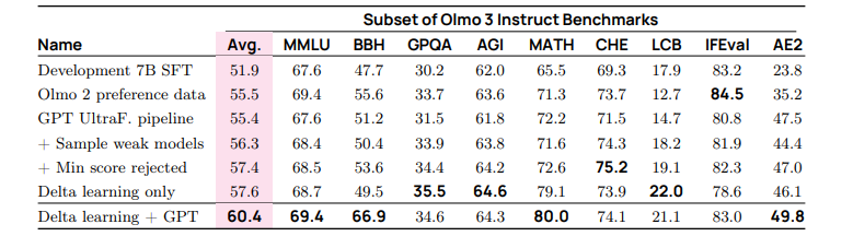 表 29 不同候好信号的比较结果:使用 delta 学习启发式方法创建的偏好对(选择=模型响应较大,拒绝=模型响应较小)与使用我们基于 delta 的 LLM-judge 流程创建的偏好对,其增益分布不同,表明它们提供了不同的候好信号。这些信号是互补的:将它们结合起来可以获得最大的平均增益。我们最终的Olmo 3Instruct 偏好数据显著提高了性能。