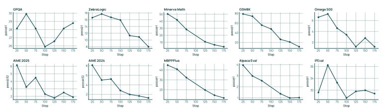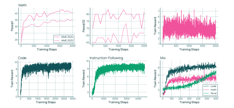 图 24 展示了 RL-Zero 在 Olmo 3 Base 数据集上不同领域的运行结果:数学、精确指令执行、代码编写以及三者混合。我们展示了数学领域的主要评估结果:AIME 2024 和 2025 测试,分别采用 Pass@1(基于 32 个样本的自举平均值计算)和 Pass@32两种方法。对于所有领域,我们都展示了训练过程中的奖励。对于混合测试,我们分别列出了每个领域的奖励。