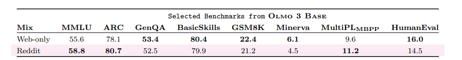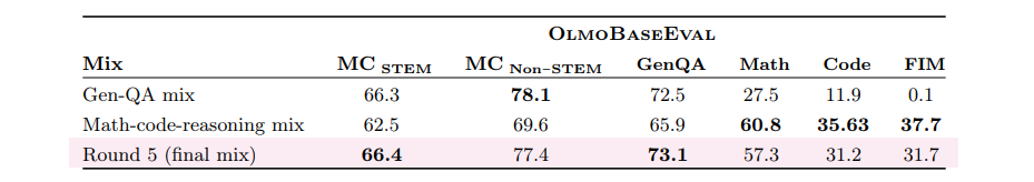 • Midtraining :我们继续使用 Dolma 3 Dolmino Mix(§3.5)进行训练,这是一个 100B 的数据集,旨在通过以下方式增强代码、数学与通用知识问答等目标能力: