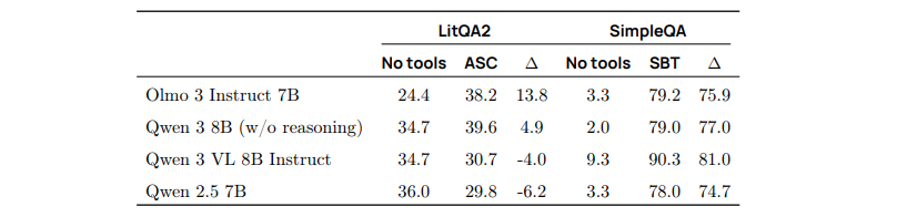对工具的需求。 我们评估了 Olmo 3 Instruct 在 LitQA2 与 SimpleQA 上的性能有多少可归因于工具使用,通过测量在仅依赖参数化记忆(无工具)与使用工具之间的性能差异。表 28 给出了这些差异,并与三款 Qwen 模型进行了比较。所有模型在 SimpleQA 上均从工具使用中受益良多。然而,与 Olmo 3 Instruct 7B 不同,Qwen 模型在 LitQA2 上主要似乎依赖参数化知识,其中两款模型在提供工具后性能反而下降。
