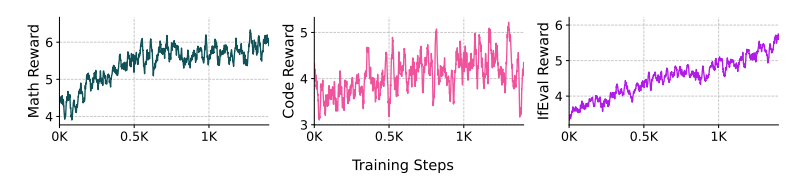 在 RL 中,各领域奖励稳步提升。图 18 绘制了每个验证器的奖励曲线及平均输出长度。我们发现各领域奖励稳步上升,但增速不同(指令遵循数据上升最稳定,编码奖励上升最慢)。更多 RL 曲线见附录(图 35)。有趣的是,我们发现序列长度先略微下降,然后随时间缓慢增加,这可能是因为推理 SFT 和 DPO 已训练模型生成最长 32k token 的推理序列。