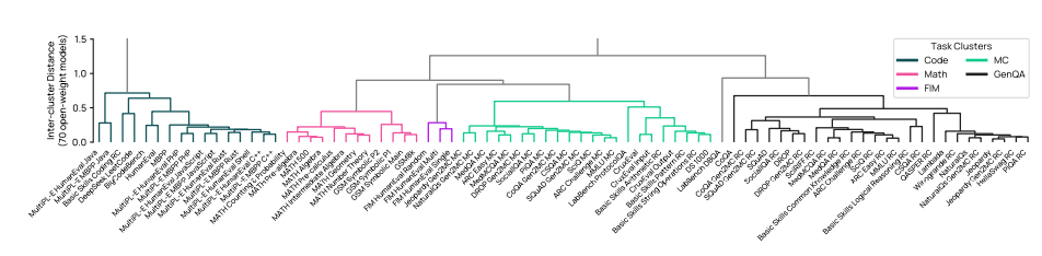 使用我们的评估结果数据集,如果两个基准对模型的排名相似,我们假设它们评估的是相似的构造。我们使用 Ward 的方差最小化法(Ward Jr, 1963)进行层次聚类,该方法通过迭代合并评估分数来最小化聚类内基准之间的分数方差。图 5 展示了聚类程序的结果,我们手动选择一个阈值以平衡聚类的数量和粒度。重要的是,我们不使用聚类程序的精确结果------我们手动移动一些任务,以确保每个聚类内任务的格式一致(例如,所有需要执行代码的任务都位于同一聚类)。最终的任务聚类包括:MCSTEM、MCNon-STEM、GenQA、Math、Code 和 Code FIM。
