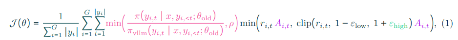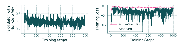 主动采样。为补偿过滤后的实例,我们的完全异步框架能够持续从 actor 拉取完成结果,并将提示重新采样入队列。我们主动采样和过滤,直到达到所需的非零梯度完成批次。此前 Yu 等(2025)的动态采样会过度采样,生成训练批次中使用提示的三倍,以合理保证批次中有足够的非零标准差完成。相比之下,我们的主动采样更高效利用基础设施。如第 6 节所示,这显著稳定了训练,并防止训练过程中批次大小减少(vanilla GRPO 常见问题)。