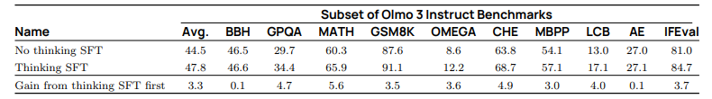 从 Olmo 3 Think SFT 开始有帮助。 我们发现,在思维 SFT 模型之上训练我们的 Instruct 模型不仅提高了基准性能(如表 26 所示),且并未增加模型平均响应长度。