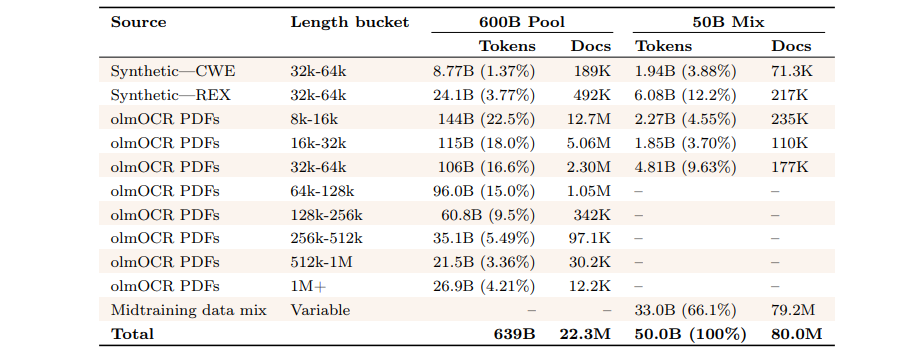 • Long-context extension(Dolma 3 Longmino Mix):我们构建了高质量数据,包括大量使用我们最新 OCR 工具 olmOCR(Poznanski et al., 2025a,b)处理的科学 PDF。虽然这些 PDF 在基础模型训练的所有阶段均会使用,但在长上下文扩展阶段尤为重要;该集合包含超过 450 万份长度超过 32K 的文档,总 tokens 超过 3800 亿,是目前公开可用于长上下文研究的最大规模集合。Olmo 3 是我们首个具备长上下文能力的模型,可在扩展后支持最高 64K 的上下文长度。