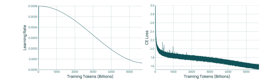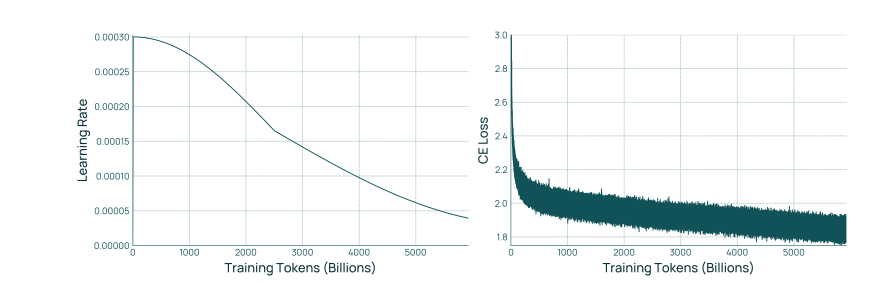 图 3 展示了 Olmo 3 Base 78 的学习率调度和损失函数。学习率调度的前半部分采用余弦调度,处理5T个 token。后半部分则拉伸至一个 epoch 的目标长度(5.93T个token)。预热阶段为2000 步,峰值学习率为3 x10-",最终学习率为峰值学习率的10%。