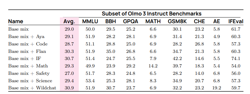 表25 我们在OLMo2上进行SFT混合消融的指导结果