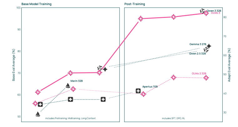 图1 在 Olmo 3 中,我们发布了完整的模型流程包括所有开发阶段的数据、代码和权重。Olmo 3Think 32B(如图所示)与 Qwen 3 328 相比毫不逊色,后者尚未发布基础模型。我们底层的 Olmo 3Base 32B与Qwen 2.5 32B和Gemma3 27B等最佳开源权重基础模型相媲美,此外,它还包含中间检查点,方便用户研究训练过程中的策略和长时间的上下文扩展方案。