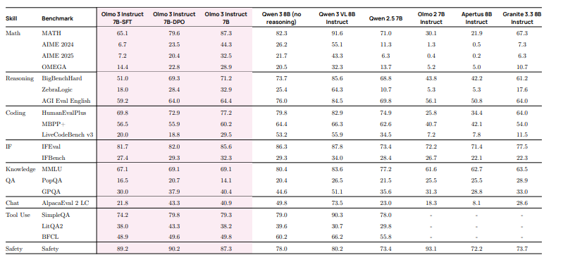5.1 Olmo 3 Instruct 的主要结果