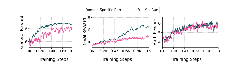 图 21 显示,按领域训练可以获得更高的训练奖励。我们绘制了按领域和整体混合(即最终)训练运行的训练奖励随强化学习(RL) 训练的变化曲线。在每个图中,我们使用 RLVR 训练一个中间 SFT 模型,该模型仅使用来自通用子集、正 子集和数学子集的数据,并与使用整体混合了集的数据进行训练进行比较。虽然特定领域的训练获得了更高的训练奖励,但图 20 显示,这并不一定能带来下游性能的提升。