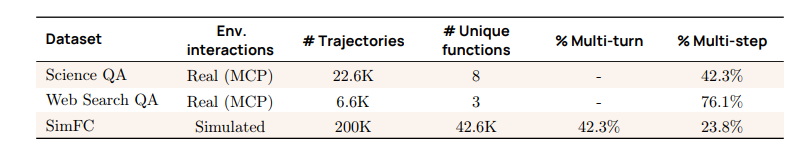 具有模拟交互作用的轨迹。 虽然在可执行环境上训练的轨迹有望教会模型有效处理真实环境输出并应对意外错误,但在规模上策划此类轨迹较困难,可能限制模型在推理时对未见工具的泛化。为填补这一空白,我们还创建了一个使用 LLM 模拟环境的合成轨迹数据集,称为 SimFC。我们从现有数据集(例如 xLAM(Liu 等,2024c)、ToolACE(Liu 等,2024b))以及公开可用的 MCP 服务器中汇集大量工具集或 API,然后提示 LLM(GPT-4o、GPT-4.1 与 GPT-5)生成包含模拟用户查询、环境响应与助理消息的完整轨迹。我们设计提示以确保数据集包含多样的交互模式,包括多轮、多步骤以及因信息或工具不足而拒绝执行的情形。关于此数据集的更多细节及用于生成的示例提示见附录 A.5.2 与图 36、37。