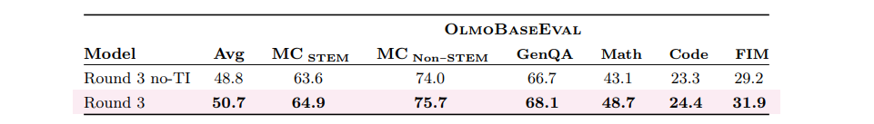 • Evaluation(§3.3) 为了避免将基础模型过拟合到某一单一能力,我们大幅扩展了来自 OLMo 2 的评估套件,加入了更多基准。同时,我们改进了在开发过程中依赖小规模实验的方式,包括如何选择和使用基准。更多细节见 §3.3。