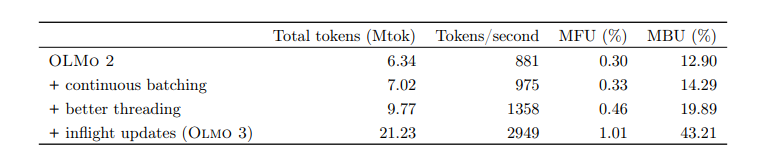 连续批处理和飞行中更新对训练速度至关重要。以推理器 SFT 或 DPO 为起点进行训练时,模型初始生成序列极长,RL 训练压力极大。表 21 显示,使用连续批处理和飞行中更新对训练速度至关重要,使我们在 GPU 数量减半的情况下实现两倍训练速度,使实验和长时间 RL 运行更可行。33 为进行仔细基准测试,我们对 OLMo 2 与 Olmo 3 之间的 RL 基础设施改动进行了消融。见表 21。对于每次消融,我们使用 2 个 8x A100 节点运行 2 小时基准实验。一个节点用于训练,一个用于推理。由于推理是瓶颈,我们仅基于用于推理的单节点报告模型 FLOPs 利用率(MFU)和模型带宽利用率(MBU)。典型全规模实验会使用更多推理节点,通常推理节点与训练节点的比例为 8:1 或更高。基准实验为每个训练步骤生成 128 个完成批次,使用 64 个提示,每个提示采样两次,最大输出长度 32000,最大输入长度 2048,导致上下文长度为 2048。