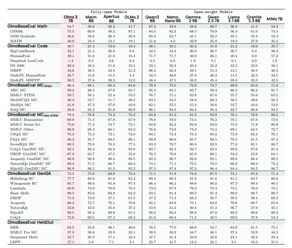 Olmo 3 Base 是目前最强的完全开放的 32B 参数模型,性能优于 Stanford Marin 32B。对于 32B 尺度,在数学和代码性能上,Olmo 3 Base 显著优于其他完全开放模型,并与最优秀的开放权重模型保持接近。在 MCQA 表现上,Olmo 3 Base 在非 STEM 领域与其他开放模型相当,在 STEM 领域则与完全开放模型表现一致。最后,在 GenQA 任务中,Olmo 3 Base 优于大多数列出的开放模型。对于 7B 尺度,Olmo 3 Base 在数学和代码性能上显著优于其他完全开放模型,仅在数学任务上被 Qwen 模型超越,在代码任务上则被 Qwen 和 Nemotron 超越。在 MCQA 中,Olmo 3 Base 与最强的完全开放模型在 STEM 与非 STEM 领域均表现相当。最后,在 GenQA 任务中,Olmo 3 Base 在列出的完全开放模型中仅次于 Marin,并且仅落后于更大的 Gemma 2 9B 和 Llama3.1 8B(对于开放权重模型)。