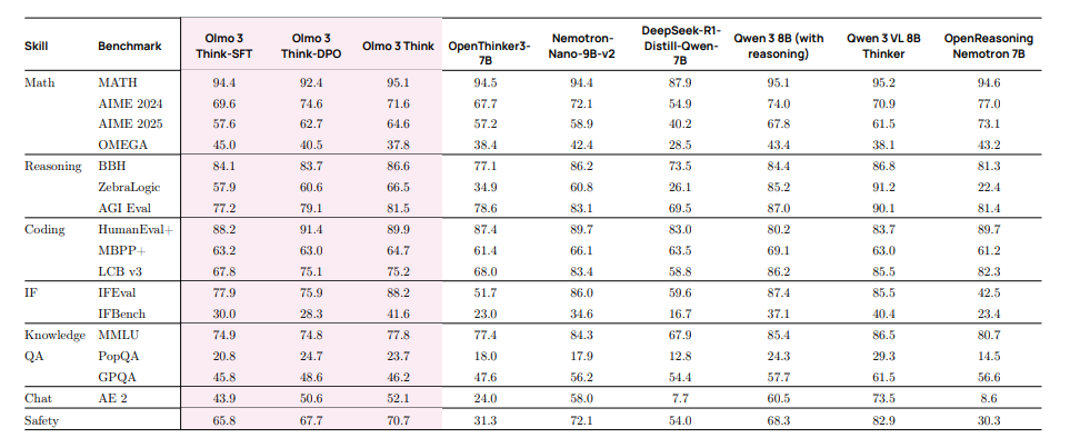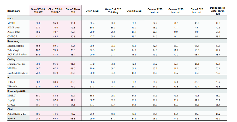 表1展示了我们旗舰机型 Olmo 3 Think-32B 在Olmo3评估套件上的测试结果。Olmo3Think-32B 是目前最好的 32 位全开源机型。