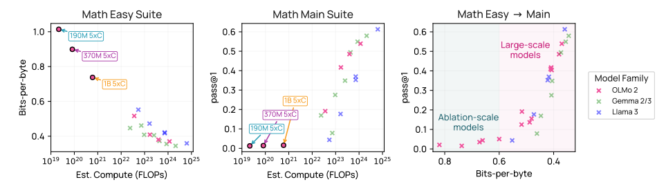 图6 展示了 OlmoBaseEval Math 套件的规模分析。我们使用 OLMo 2 规模模型(Bhagia 等人2024)来寻找基准和指标,这些基准和指标能够为小规模模型(左侧和中间)提供有效信号。然后,我们使用小规模的 OlmoBaseEval Easy 套件作为代理指标,用于数据决策。